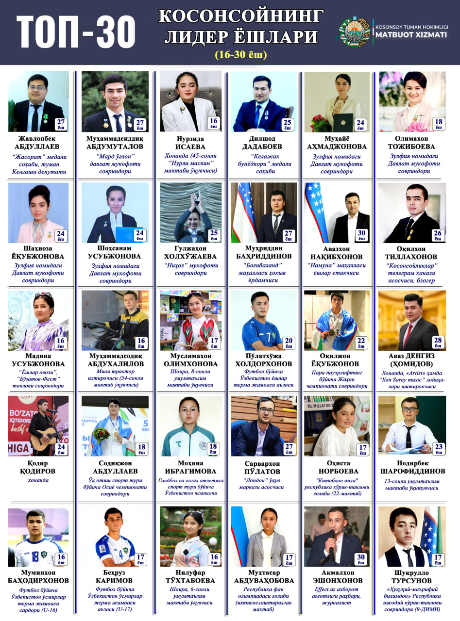 Косонсой туман ҳокимлиги Ахборот хизмати томонидан косонсойлик "ТОП-30" лидер ёшлар рейтинги ҳавола этилмоқда.