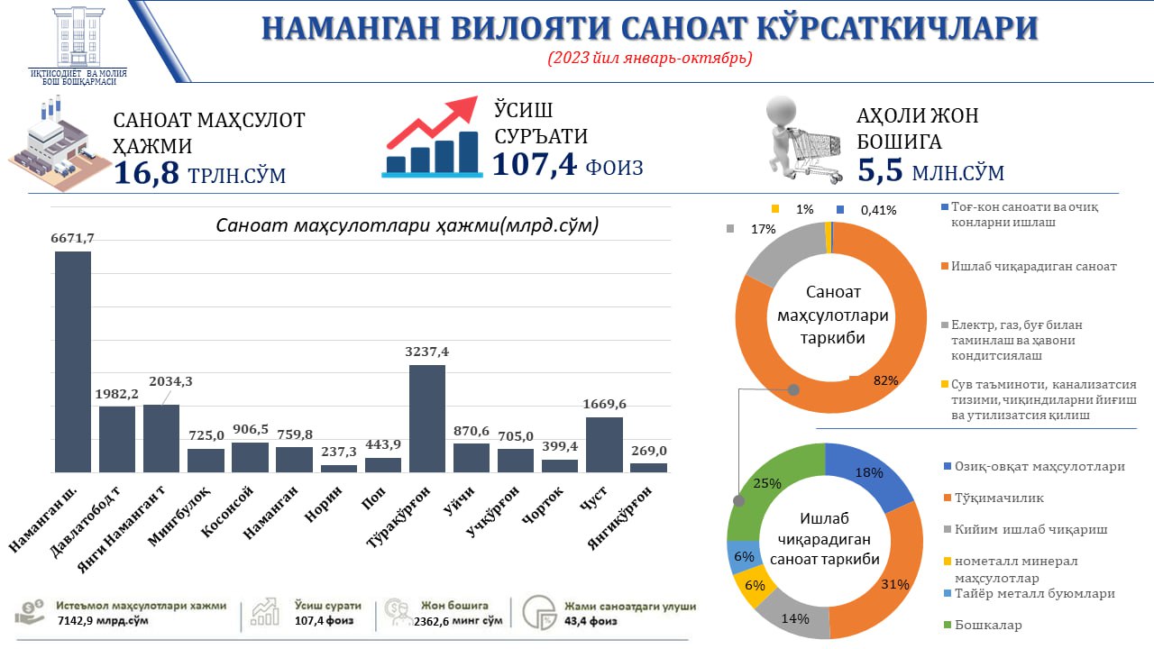 Вилоятда бугунга кунга қадар 8,3 мингдан ортиқ саноат корхоналари рўйхатдан ўтган.Ушбу корхоналар томонидан ишлаб чиқарилган маҳсулотлар ҳажми 16,8 трлн.сўмни ташкил этиб, ўсиш суръати 107,4 фоизга ортди.