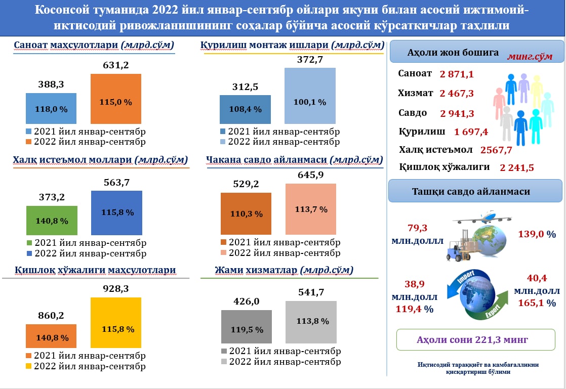 Умуман олганда, Ўзбекистон иқтисодиёти 2022 йилнинг дастлабки 9 ойида ташқи муаммолар кучайганига қарамай, ижобий динамикани сақлаб қолмоқда. Жаҳон товар бозорларида нарх ўзгарувчанлигининг кучайиши, логистика таъминот занжирларининг узилиши мамлакатда инфляциянинг тезлашишида намоён бўлмоқда.