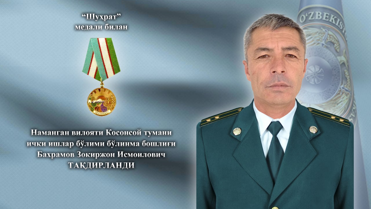 Ўзбекистон Республикаси Президентининг “Ўзбекистон Республикаси давлат мустақиллигининг ўттиз бир йиллиги муносабати билан ҳарбий хизматчилар ва ҳуқуқни муҳофаза қилиш органлари ходимларидан бир гуруҳини мукофотлаш тўғрисида"ги Фармонига мувофиқ Наманган вилояти Косонсой тумани ички ишлар бўлими бўлинма бошлиғи Бахрамов Зокиржон Исмоилович - “Шуҳрат” медали билан тақдирланди.