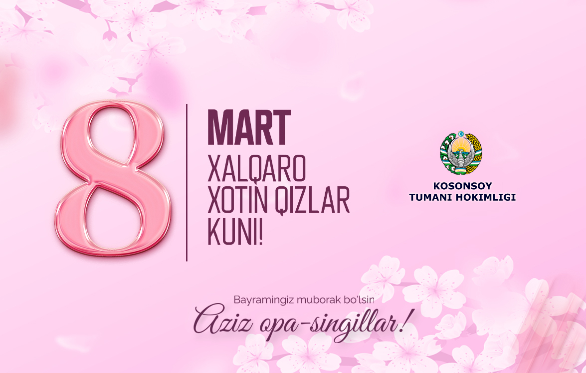 ▫️Бугун мана шундай қутлуғ баҳор айёмида Сиз, мунис оналаримиз, ҳурматли опа-сингилларимиз, бутун туманимиз хотин-қизларини гўзал байрам – Халқаро хотин-қизлар куни билан чин қалбимдан муборакбод этаман.