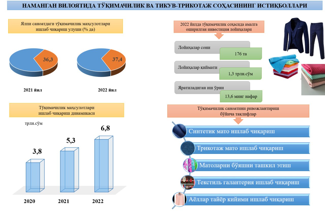 ✅ Вилоятда тўқимачилик ва тикув-трикотаж йўналишида 2250 дан ортиқ корхона фаолият юритаёган бўлиб, улар томонидан 2022 йил давомида ишлаб чиқарилган маҳсулот ҳажми 6,8 трлн. сўмни, экспорт ҳажми эса 386,0 млн. долларни ташкил этди.