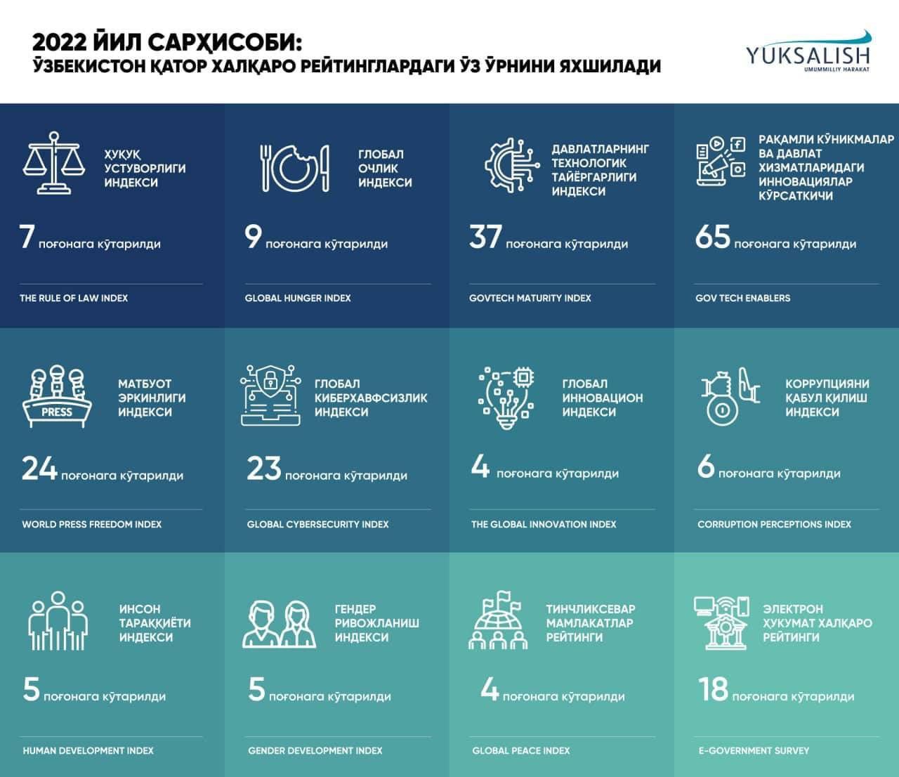 🔘 2022 йилда эълон қилинган халқаро рейтингларда Ўзбекистон ўз ўрнини яхшилади. Масалан, GovTech Enablers индексининг рақамли кўникмалар ва давлат хизматларидаги инновациялар кўрсаткичи бўйича дунёда 4-ўринни эгаллаб, ўтган йилга нисбатан 65 поғонага кўтарилди.